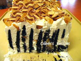 Before I give you the "recipe", let me just say that there really isn't a recipe. It's just homemade whipped cream, chocolate wafer cookies (chocolate graham crackers work too), and some decorations (nuts, candies, sprinkles, etc.). Then it sits in the fridge overnight. By the next day, the cookies (or graham crackers) will have softened, and they will taste just like cake !!